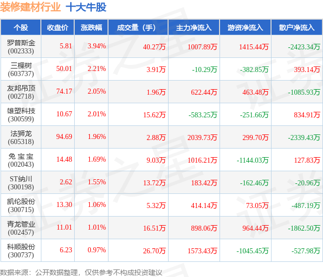 盟国吊顶(002718)、雄塑科技(300599)、法狮龙(6318)均